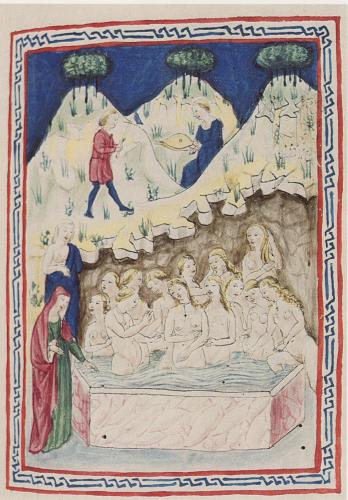 A couple of years ago I undertook some research into the Voynich manuscript. This is a strange manuscript on vellum written in a weird unreadable script which some people suggest is a code though it has never been broken. It seems to date to the late 15th or early 16th centuries. It contains many drawings, a section which is obviously a herbal with pictures of unidentifiable plants, an astronomical section with circular diagrams, a balnealogical section with picture of bathing women, and some other graphical material. About two years ago I presented some new information to the Voynich discussion group that the balnealogical section could well be representations of the thermal and sulphurous healing baths at Pozzuoli in the area called the Phlegrean Fields, West of Naples. This is a volcanic region where hot springs bubble up, and it has been used since Roman times, but was still actively being used in the Medieval and early modern periods. The Voynich discussion group rejected my research as they were taken up with grand theories and most of the contributors did not have their feet firmly planted on the earth and consequently their heads were rather in the clouds. So I had just pushed this to the back of my mind, when today looking at a book on Italian Renaissance book illumination what should I see but a manuscript showing yet another image of the Baths of Pozzuoli, written in the third quarter of the 15th century and thus contemporary with or slightly predating the Voynich manuscript. It seems to me so obvious that the creator of the Voynich manuscript had seen a manuscript depicting the Baths at Pozzuoli, either this one or some other (there are a number which have survived), however, the Voynich speculators are not interested in something so prosaic and obvious. The text of the Voynich cannot be read, but the images can be contextualised and thus the subject matter of the manuscript can be revealed. Art and images so draw on earlier examples, that one can see how images emerge from an earlier context. Just as Bosch drew on the depictions of zitirons and other strange beasts in Flemish manuscripts available in his time, so the author of the Voynich drew on depictions in earlier manuscripts of the baths at Pozzuoli when drawing his figures. Click here to see my 2006 research into the Voynich manuscript.