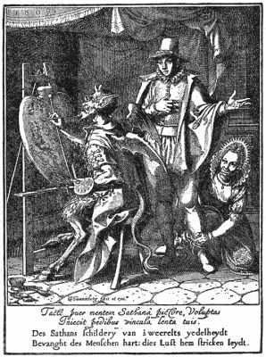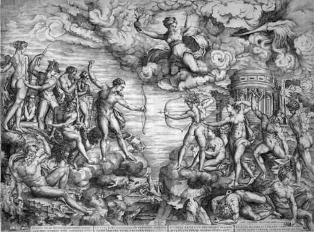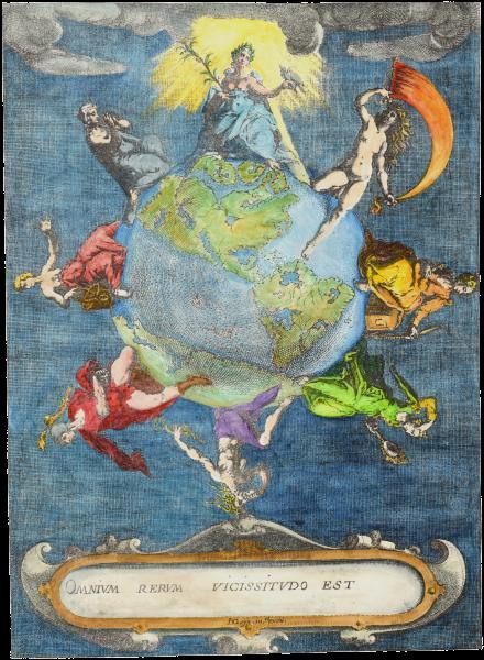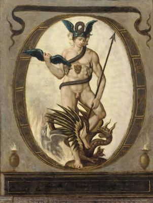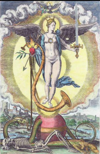 Six months ago I posted the coloured version I had made of an engraving I had then discovered. Today I have found a painting of the same emblem emanating from the circle of the mannerist painter Bartholomaeus Spranger (1546 – 1611) which was sold at Christies in 2002. This is a small oil painting on copper. The engraving was made by Hyeronymus Olgiatus in 1569 so must be the original image.