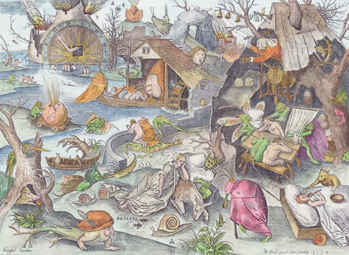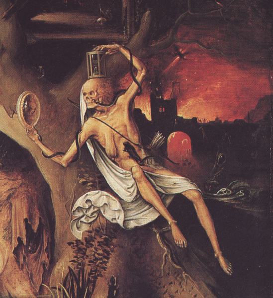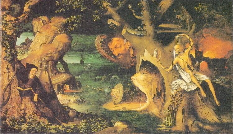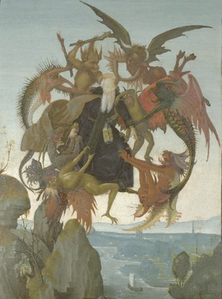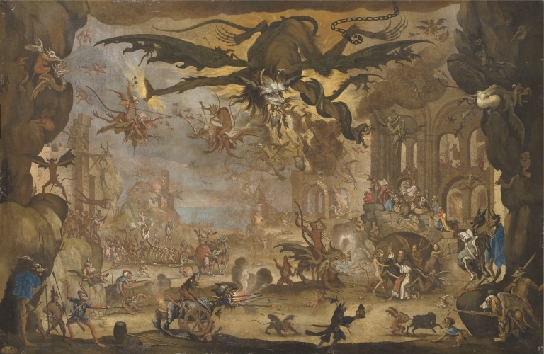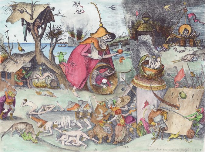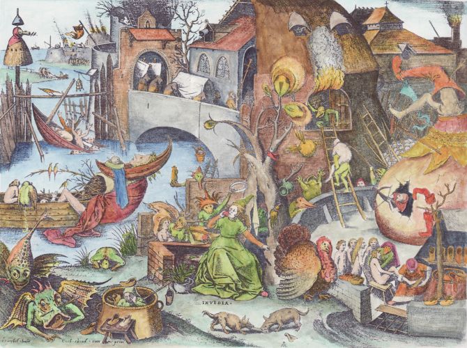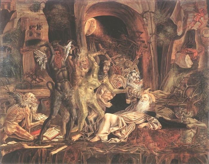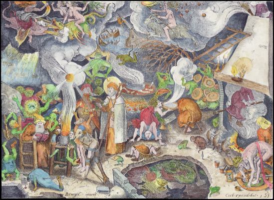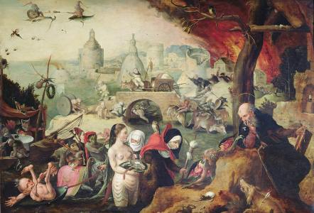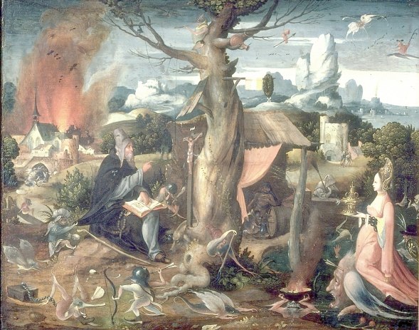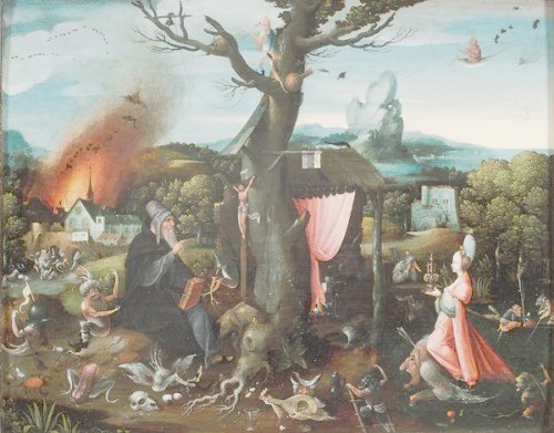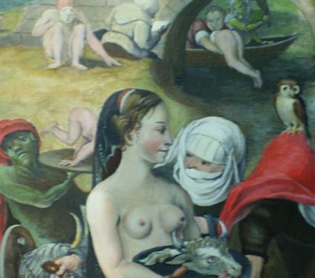 I found this rather fine painting by Jan Mandyn, one of the Antwerp-based followers of Hieronymus Bosch. This is one of his paintings on the theme of the Temptation of St Anthony. Here I show just a small section from the right hand side, which I find rather engaging.