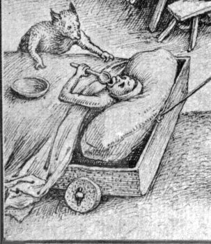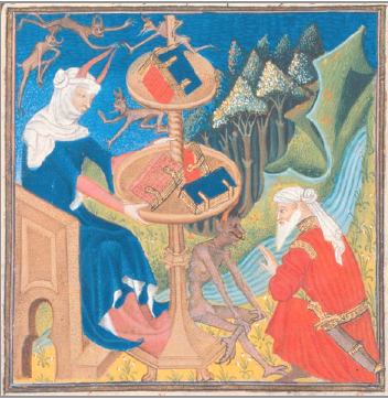 by the illuminator, Orosius Master. It shows a philosopher being instructed by Philosophia, while demons attempt to distract him.