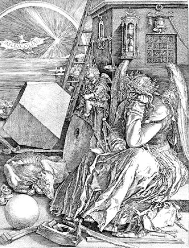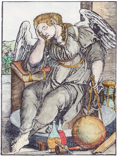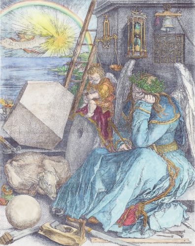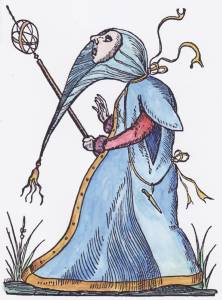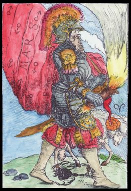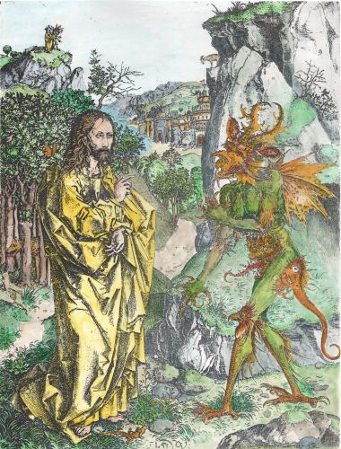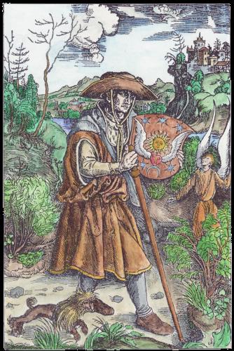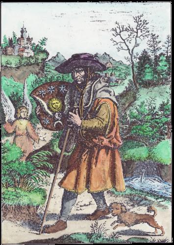 A few years ago I found an interesting illustration in a modern French book on alchemy. This engraving clearly showed a figure carrying a shield with sun, moon stars and winged heart and I put it down as an alchemical emblem. This modern French book did not identify the book from which it was taken, except to say it was an illustration in a work of Louis Cadet de Gassicourt (a late 18th and early 19th century writer). I asked some colleagues what it could be and one suggested that it was most likely an emblem of St Jerome with no alchemical significance. I put it in my pile of images to colour and eventually forgot about it. A week or so ago it surfaced from a pile of images and I decided to hand colour it. A few days later I was in the University library looking at some art books, when suddenly I spotted a woodcut by Durer that was of the same image, the only difference being, that the engraving was a mirror image of the Durer. I realised how stupid I had been. The figure in the Durer woodcut is holding his staff in his right hand, while in the engraved version it was in his left. The engraving had obviously been copied from the Durer, as this printing process reverses the left and right sides of an image. I should have noticed that earlier. The Durer woodcut is quite delightful and I immediately began making a coloured version of this image also. The Durer woodcut was made in 1494 and was included in an Italian book Gerson nei panni del pellegrino ("Gerson in the clothes of a pilgrim"). Jean Gerson (1363- 1429) was French scholar, educator, reformer, theologian and poet. So this image is not alchemical but certainly allegorical and emblematic. I show the two images side by side (the Durer on the left and the later engraving on the right.