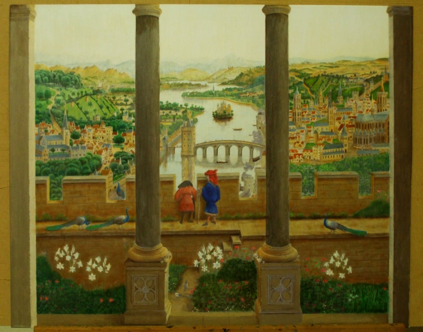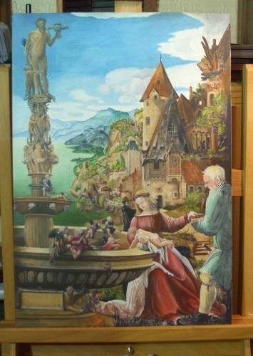 I made a group of paintings on canvas in 2000-2001. Last month I heard from a collector who had bought five of these works back in 2000 and he sent me a photograph of these on the wall of his home, so it is great to know that they are still together in his collection. I also sold a few of these paintings on canvas to individuals. So the last of my canvas paintings have gone. Around 2004-5 I decided to move away from canvas and work instead on board. This arose because I wanted to make copies of early paintings and I found it impossible to achieve the detail as the weave of the canvas limited what one could do, so I moved on to painting on a completely smooth surface. I doubt I will ever go back to canvas. My most recent painting, on which I an still working, is my recreation of the view from Chancellor Rolin's window as originally painted by Jan van Eyck. It needs at least 20 more hours of work, but all the forms are well established. It is all about detail, detail, detail. It will be difficult to part with this.
