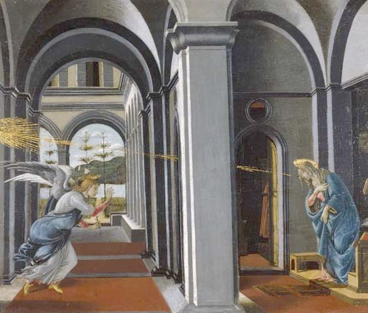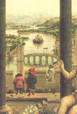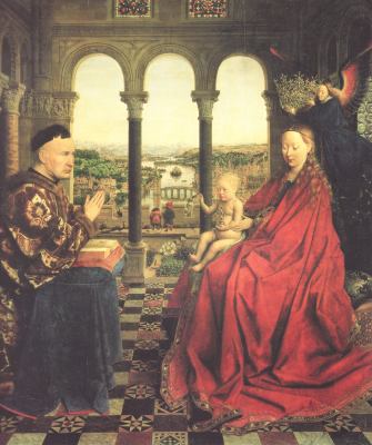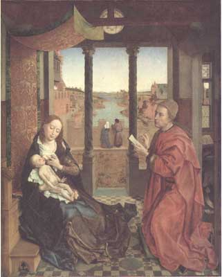 Rogier was obviously echoing Jan van Eyck's Madonna with Chancellor Rolin, made a decade or so earlier in 1436 (which I show on the right). I really love the view though the window in van Eyck's painting out across the town set astride a river, and if I can ever get a sufficiently detailed image of this, I will attempt to make a facsimile painting in oils of this view through Jan van Eyck's window of an idealised townscape.