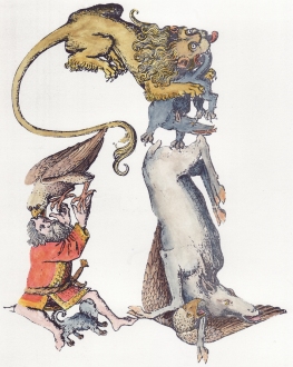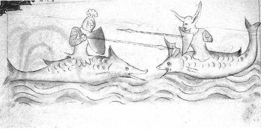 Following up on the zitirons (also known as Zeeridders) a correspondent pointed out to me another example in a manuscript in the Koninklijke Bibliotheek in the Hague of Jacob van Maerlant's poem Der Naturen Bloeme. Jacob van Maerlant lived in the 13th century but this particular Flemish manuscript with many illuminations was made around 1350.