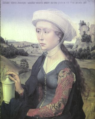 I am continuing to work on my version of the right wing of Rogier van der Weyden's Braque Triptych. This small scale piece was made around 1450 for the oratory of a wealthy merchant, Jean Braque. The right wing shows Mary Magdalen. I was rather drawn to this work, not for its religious theme, but for the wonderfully melancholic figure of Mary, and her setting in an idealised Northern European landscape. As with many of these 15th century works the areas where the artist has used significant amounts of white mixed in his paints, such as the sky and the face, have badly cracked, so I like to make a copy which shows a little of how the painting would have looked in the the century immediately after it was painted. I also worked her blue cloak in a slightly different way, using continuous tones for the modelling, rather than the way in which Rogier painted the form of the cloak in a dark colour then modelled the folds using small strokes and filaments of slightly lighter blue paint. I worked the face in just two sessions and will not touch it any more, as the thin paint layer seems to look okay. One thing I really like about this painting is the idealised landscape. I will spend a great number of hours adding as much detail into this as I can see in the reproduction I have of Rogier's painting, as it really makes the painting. I have done it about the same size as Rogier's original. It is at the limits of my technical ability. I show the original opposite. When I get access to my digital camera I will photograph my version and put it up on this site. It will be an expensive painting as it will absorb many hours of my time.