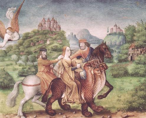 One of the features I especially like about 15th century art, both in manuscript illuminatons and in paintings, particularly Flemish, are the wonderful stylised landscape forms, usually as appearing as a background to a portrait and often glimpsed through windows. So I was delighted today to find an illustration from the Savoyard Apocalypse which sets the powerful and horrific events of the Apocalypse in this rather charming, gentle and safe landscape. It is this delicious contradiction which especially delights me. Here we see the Whore of Babylon seated on the beast with seven heads, but somehow one does not feel the world is about to end ! I must try and find more images from this manuscript.