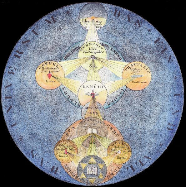 This week I have scaled back on other work and set to colouring the large elaborate alchemical/mystical emblem I mentioned earlier. It is very exacting work. I find I can only do about four hours a day on it as I need the extra time to contemplate the colouring schema and to avoid losing concentration and spoiling the piece. I have made some progress but it will probably not get finished till next week. It is an astounding piece. I have enlarged it by about 150% to 28 by 22 inches (700 by 550 mm) and the detail is still amazing. I will reduce it back to about its original size when I make a print of it. Among the main problems is creating sufficient saturation of colour without burying the forms. It is essential to be using the correct size brush for different sized areas. My colouring schema draws on my experience of examining the D. A Freher mystical manuscripts. It is not a matter of chosing colour on aesthetic grounds, but these must echo the mystical ideas that the emblem is attempting to communicate and some colour correspondencies that should be respected. Thus there are subtle gradations of light and darkness, reflecting the spirit becoming more immeshed in matter. It is also important to apply many layers of colour on some areas to create a rich texture of tonalities. Mere flat areas of colour would let the piece down. So far I have coloured about 20% of the surface area.