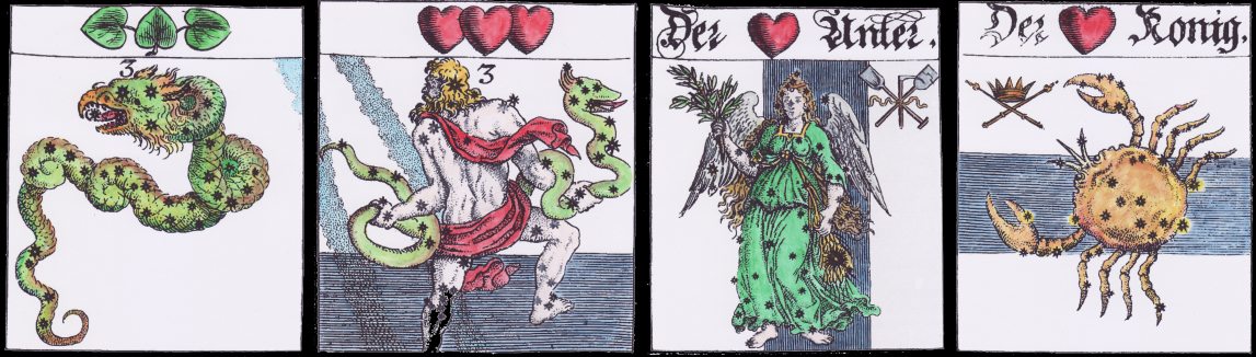 I am almost half way through colouring the engravings of the Astronomical card game, which was published as illustrations in the book Das Astronomische Kartenspiel, Nurnberg, 1656. I was immediately taken by these engravings which are based on the Uranometria of Johann Bayer printed at Augsburg in 1603. The astronomical card game has the standard 52 cards with the four suits of hearts, acorns, bells and leaves which was usual for German playing cards of that period. Once I have completed the colouring I will make this into a book for my Art Books Series.