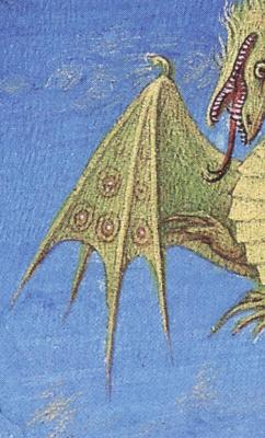 A few days ago I was looking at a book I have with high quality illustrations of the early 15th century illuminated manuscript Tres Riches Heures, the work of the Limbourg brothers. This Book of Hours was made for the Duc de Berry between 1410 and 1416, and has many wonderful full page miniatures painted on vellum. I was paticularly interested to see some extreme close up illustrations of these illuminations, as one could clearly see that areas of the painting were made with little short strokes of the brush, applied one beside another on top of a ground colour, to give the modelling. Such detail of the way in which the artwork was painted is not easily seen in most illustrations which are very small, and the half-tone screen of the colour lithographic printing obscures this further, but the detailed illustrations in this book revealed this key aspect of the way in which the paintings were created. I show one example here, though the scans I made from the book, in fact, only just show these little stab strokes. You can see these in the sky and the dragon's wing. It reminded me somewhat of the way in which Hieronymous Bosch painted. Bosch's large paintings look, in book sized modern reproductions, to be smoothly modelled, as in the work of Jan van Eyck, Rogier van der Weyden, or Hugo van der Goes, but on close examination the paint surface is in fact thin and seemingly applied in small strokes.