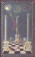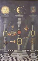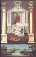 I have always had an especial interest in emblematic imagery. Of course, I have almost exhaustively explored alchemical emblems (though there are still items to discover even after all these years of research). This year I am exploring some emblem systems that run parallel to alchemy, and have sourced material in woodcuts and engravings to colour for my Art Book series. For many years I have been fascinated by the tracing boards used in freemasonry. These are complex diagrams, often created on cloth or board which was laid on the floor of a lodge during the initiation rituals. I suppose the new initiate had to study the symbols and have these explained by the master of the lodge. Masonry is a strange spiritual/religious system which endowed the working tools, trowel, level, mallet, square and plumbline, and accoutrements such as pillars, cords, stone blocks , etc., of the craftsman mason with some spiritual significance. Often they draw on the supposed form of the Temple of Solomon. Anyway, I have managed to gather over twenty designs of these tracing boards (also known as trestle or tressel boards) which appear as engravings in 18th and 19th century masonic books and have begun colouring these for the next book in my Art Book series. The original engravings are, I suspect to the modern eye, rather dull and uninspiring, but I think that a sensitive colouring makes them more engaging. Here are two examples.