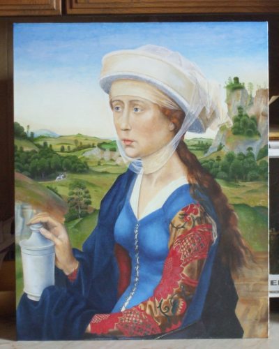 On seeing that I was now devoting time to painting one of my contacts amused me with the remark that I seem to be the champion of lost causes, constantly swimming against the tide of current opinion. With my attempts to pursue alchemy as it really was, through looking at its original documents, rather than jumping on the esoteric bandwagon that is so popular nowadays. Also my interest in modern tarot as art, when the art world just sneers and ridicules this as junk and ephemera. Now he says, I have gone one better and am trying to interest people in art that died 500 years ago. He thought me completely misguided in trying to make facsimile copies of 15th century artworks, and even suggested that one can buy these from various Chinese factories for around $50, so why bother. I must say I found this a little bit insulting as this person has not seen the quality of my paintings nor compared them to the output of the Chinese sweatshops. I saw a documentary on these Chinese mass produced paintings recently. One artist was making a copies of the same painting by van Gogh working on a kind of assembly line, where he did 20 or so at at time, going from painting to painting working on the same area. It seems he was making hundreds of copies a day! I wonder how he would manage making a copy of the Rogier van der Weyden or an detailed alchemical work such as an image from the Splendor solis. Anything can look good when it is shown as a small image on the computer screen.