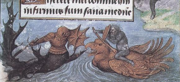 Last night I came across a word I had not heard before - "zitiron". This is a strange beast found depicted in some medieval manuscripts. A zitiron is man-knight riding on or fused with a fish body. Here are two examples, the first from from Queen Mary's Psalter, made in England around 1310-1320, and the second from the Book of Hours of William Lord Hastings, around 1480.