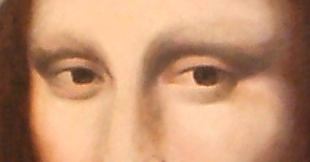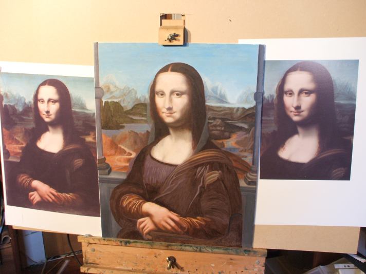 I wanted to set myself a little challenge and make a facsimile copy of the Mona Lisa, just to see what was possible. Early on I decided to work from a 17th century copy rather than primarily from the familiar original. The original painting appears to have been damaged in some areas by some over vigorous cleaning in the past and detail and colour has been lost, especially from the background. When I looked at photographs of this copy, I could see the intact columns which framed the window in front of which the figure was sitting. These seem to have been cut off the original, leaving only shadows of the pillar bases. Also the figure is seated in a chair, something not now immediately obvious in the original painting, but if one looks deeply into it one can see the arm of this chair, though it is almost lost in the dark background. I decided that, rather than make an exact copy of the familiar Mona Lisa, I would attempt to do a little restoration or reconstruction to bring out some of the lost features. I have thus lightened her garment to bring out the folds and also lightened her translucent veil. This is a puzzling feature in the original painting, as it appears on the side of her face almost like the shadow of painted out hair, however, on deeper examination one can see that it continues around behind her head and emerges on the other side of her face. It is quite lost within the darkening of the paint and the varnish. I decided to lighten this and make it visible again. One can thus see that her hair is not let down in the modern style but is contained within this veil, as would be more seemly for 15th century aristocratic women. As I show in the photo above, I am about half way through completing the work. I have to apply a few more layers to the face in order to smooth the forms more and seemlessly blend the tones. Having now heightened the details in her garment and the wooden panelling under the window, I must now apply layers of earth tones over this to darken it down a bit and make the shadowed areas more realistic. In the original the paint has badly cracked (particularly where white pigment was used) into those fine filaments known as craquelure. In my painting the image is of course totally smooth.