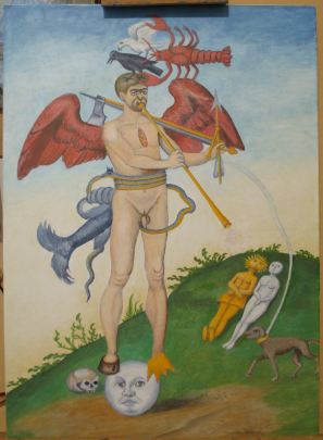 I really love this image of the man with the glass sphere head emerging out of the swamp. I decided to make a copy not from the most familiar London, British Library manuscript of 1582, but from the earlier original of 1545 now in Nürnberg. On my easel I have printouts of the London on the left and the