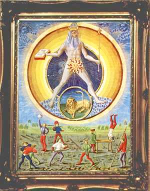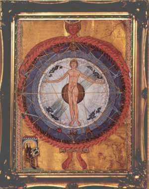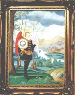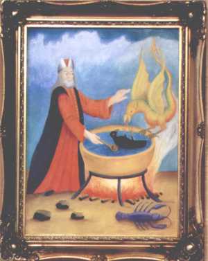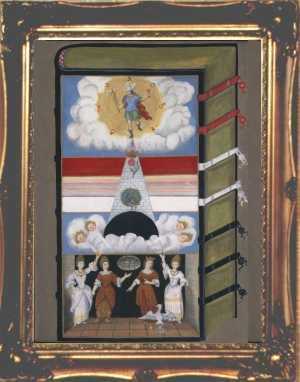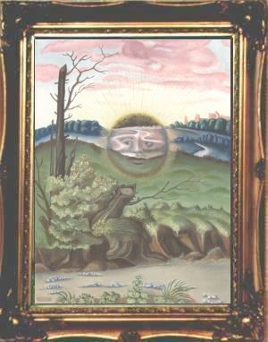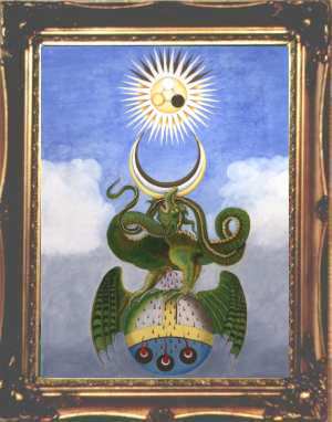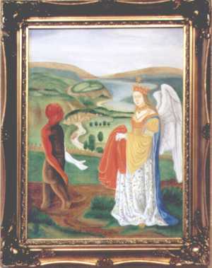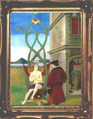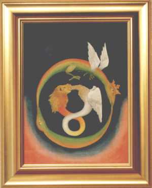 This makes his paintings unique - old fashioned exact copies of traditional hermetic images rather than wild expressions of personal insights. As he is primarily involved in publishing books, running the alchemy web site and study courses in alchemical symbolism, he does not have much time to devote to painting, so he can only produce a few completed works each year. This makes these paintings quite collectable. All the works he produced in 2000 were quickly sold. Unfortunately the photographs shown here do not reveal the detail in the paintings. He usually employs a heavy classical style of frame, as this, he feels, suits these works.