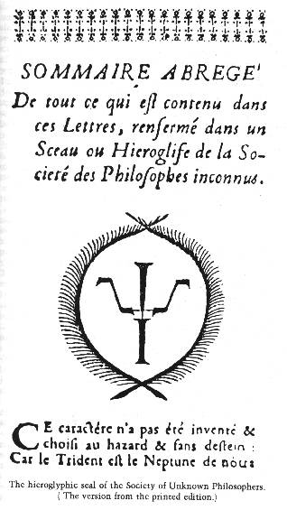 Another interesting thing about the letters is that in several versions there is at their end a "Hieroglyph of the Society of Unknown Philosophers" (or of "The Rosey Crucian Society" in Manly Palmer Hall's copy). But in the three cases I know they are totally different: in the Paris 1691 edition it is a "Trident of Neptune" (which looks rather like the Greek letter Psi) encircled by two feathers, in the Latin manuscript it is the letter M within a circle and with a horizontal line across, while in the M.P. Hall's English manuscript there are four circular figures taken from Jacob Boehme. This last case is of no interest as it is from the 18th century, but Neptune appears prominently in Sendivogius's Parable and the letter M with some additions is also the chief motif of the Rosicrucian seal reproduced by Michael Maier in his Themis Aurea [27].
