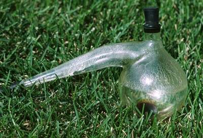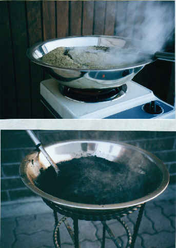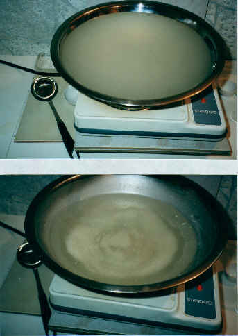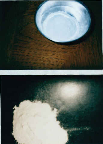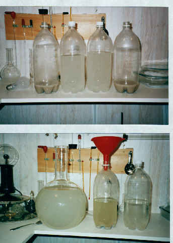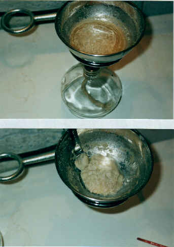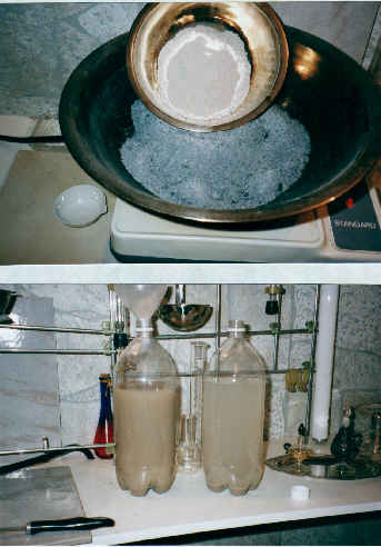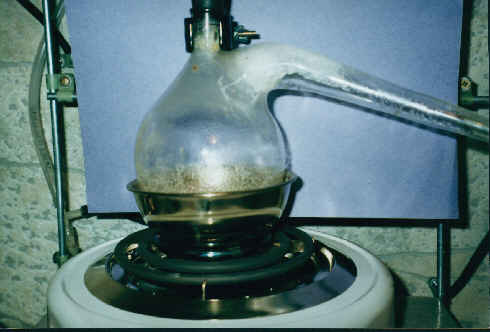 Salt Volatilization Experiment Steve Kalec These pictures present in sequence and in order the steps of the operations involved in this most interesting experiment of volatilizing of the salts of the Rosemary herb. Thanks must be given to our good friend and brother Rubellus Petrinus who's guidance and tips were always well appreciated. In anticipation of making a great medicine, many hours of great enjoyment were spent on this work that have often continued well into the late nights and morning hours. Description of the Pictures 1 Incineration ![]() The incineration of the Rosemary to drive off the carbons and all superfluities to obtain the black ashes wherein is hidden our precious salts. Our sulfur is also driven off with this incineration however we are not worried about this loss since our salt will be reintroduced into 150 mil of pure Rosemary oil through the cohobation just prior to the distillation. It is recommended to do this incineration in the night hours if one lives in a residential area since the amount of smoke released is very invading and the awesome smell produced by the burning carbon and sulfur are strong and penetrate into neighboring homes provoking allot of curiosity. 2 Calcination ![]() Solomon Trismosin says " Heat turns all black things white." This is our calcination to remove the darkness from our matter. We can see the great amount of heat that develops in our black ash. The continuation of this heat is prolonged through several days of work as our darkness is replaced by a light gray colored ash. 3 Manipulation of our Ashes ![]() As our ashes become more and more light in color, so does the volume diminish as the impurities are continuously driven off back to their source in nature. When we are satisfied with the light colored of our ashes we then dissolve them in distilled water to separate the soluble salts from the insoluble salts. 4 Leaching out the Soluble Salts ![]() The insoluble salts precipitate to the bottom of our water bottles leaving a milky water ladened with the soluble white salts. We siphon off this salty milky water and preserve it. We dissolve over and over the ashes until all our soluble salts have been extracted leaving behind the "Caput Mortem" . 5 Evaporation ![]() Through the evaporation produced by the heating, we reclaim our soluble salts. They coagulate and emerge from the bottom of our vessel as the waters slowly recede. A very gentle heat and a slow process through hours and days is required so as not to lose some of our salts into the air with the evaporation. 6 Emerging Salts ![]() At the final stages of the developing of our salts, the very gentle heat of an alcohol burner is enough. The crucible size is always altered for proper size which is important for proper operation. Nearing the end we must stir continuously and vigorously so as to prevent spitting and splattering. We must remove our salts before they become rock hard so that we may more easily render them into powder form in the mortar . 7 Second Dissolution ![]() These soluble salts are once again dissolved in hot distilled water to ensure that all the darkness has been removed from our salts. As can be seen to our surprise, more dark ashes have separated and precipitated to the bottom of the bottle. The whole process of the "Evaporation" is again repeated as before. 8 Whitened Salts ![]() At this point the purity of our salt was ensured and satisfaction was had as can be seen by the bright whiteness of the powdered salts. When performed for the first time one cannot help but be amazed by such a purity. A little taste of these salts prove themselves to be very active. An exhilarating and heating action is felt instantly on the tongue. 9 Distillation Setup ![]() A 500 mil retort was set up on an electric stove. An ordinary 8 mm glass tubing was used to extend the beak of the retort to a 250 mil receptor. 10 Distillation ![]() 150 mil of pure Rosemary oil was cohobated with 30 grams of our purified salts. Little by little the salts were added to the oil as the key described by our brother Rubellus Petrinus was observed and respected . For more information on this key, see http://www.terravista.pt/mussulo/2005/. The heating of our oil must be of a slow and gentle simmering level to prevent bumping and splattering into the upper half of the retort. The mixture of our oil and salt produces a dark coffee color in our retort. 11 The Volatilized Salt ![]() Approximately half way though the distillation our salts start to volatilize and begin to be seen as they deposit in the beak and the upper part of the retort. Nearing the end of the distillation the volatilization greatly increases so that a white vapor can be seen to fly upwards in the retort. The distilled oil is replaced into the retort after cooling and distilled again to wash the volatilized salts from the beak into the receptor . This process of simultaneous distilling and washing was repeated three times until satisfaction was had that all the salts have been volatilized. We can see the salts as ice formed, deposited and collected in the inner upper surface of the beak of the retort as a beautiful, bright, clear and crystalline substance. 12 The Exalted Salts ![]() The ancient alchemists have discovered that matter can be volatilized and exalted. They have found ways to spiritualize matter to make it be fitting as a proper vehicle for the higher forces of nature. " It ascends from earth to heaven and acquires the power of the Above…." To me these salts are now truly sacred and are ready to be used as a vehicle for manifestation, to clothe and give garment to our purified couple, our sulfur and mercury. ![]()