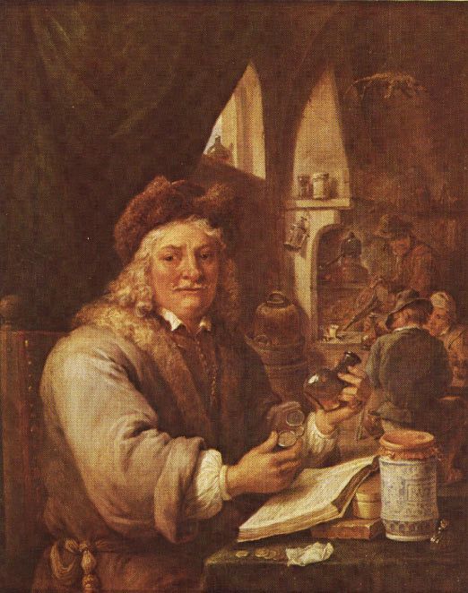This painting is a self-portrait when David Teniers was 70 years old. It is recorded in 18th century inventories as "A doctor in urines" being clearly an allusion against charlatan doctors. Although Teniers' paintings are social satires, when seen through our twentieth century eyes they can appear in a more romantic way as a celebration of alchemy. ![]()