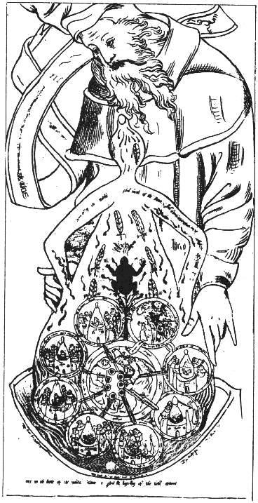 The well known illustration from Ashmole's Theatrum Chemicum Britannicum shows the Toad at the bottom of the symbolic process, probably indicating its beginning. It is interesting that it joins the male and female figures, as if it symbolized the power of attraction with some sexual overtones. The whole figure is entitled "Spiritus, Anima, Corpus", of which the Corpus or Body is the male-female pair. The whole possible sexual aspect of alchemy is still completely unknown and waiting to be explained but it may be interesting to note that Thomas Vaughan, who illustrated Ashmole's collection, made numerous sexual references in his own alchemical works, especially Aula Lucis. In his notebooks Vaughan explained how he had made the "oil of Halcali" with the help of his wife. According to A.E. Waite this oil is the First Matter which connects it with our Toad symbol. [14] The sexual symbolism of the Toad can also be found outside alchemy, which strengthens our argument. On the great painting of Hieronymus Bosch The Garden of Earthly Delights, on its right wing, there is a figure of a woman with a toad on her breast which symbolizes the sin of debauchery. [15] A sculpture in Strasbourg entitled The Seducer of Unfaithful Virgins depicts snakes and toads climbing up a handsome youth's back while he holds forth an apple. [16] So the toad may be understood to symbolize the power of sexual instinct, the force of attraction of the opposites, which in the official morality was seen as something loathsome and vulgar.