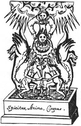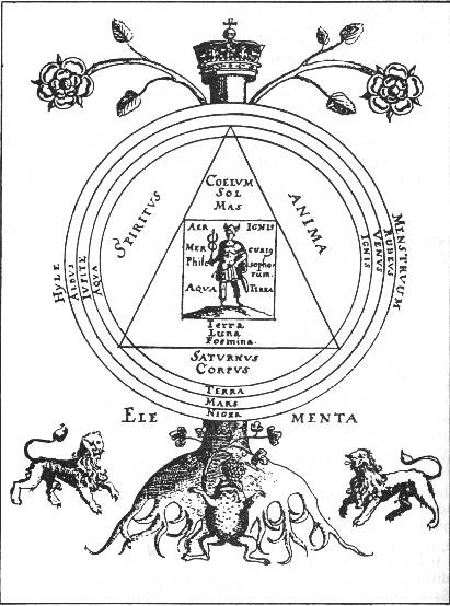 Of the 17th century Rosicrucian heirs to the alchemical tradition I found only two who used the Toad symbol. The less important in this context is Johann Daniel Mylius. In the very numerous engravings found in his works the Toad appears only on the title page of Opus Medico-Chymicum, inside the triangle of Air, chained to the Eagle above it. It probably refers to the volatile (and therefore "aerial") principle of solid bodies or, otherwise, to "fixing of the volatile". It is interesting that the same image of "bird above toad" appeared in The Crowning of Nature but without the chain joining them. In the text of the latter, however, mention is made about fixing the Elements cast forth by the Toad until they are inseparable. Some shift of meaning must have occured between the two uses of this kind of symbolism.