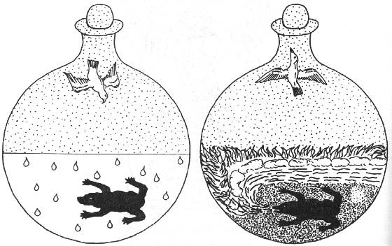 Seen in this light the first plate from Barchusen is a summary of the whole process of the Great Work and thus an integral part of the series. The only objection may be that the very important symbol of the Dove appearing on plates 10-36 is not included. It seems, however, (and is supported by the accompanying text) that the Dove is only the indication of the direction in which the Spirit (or the volatile principle) goes at any stage.