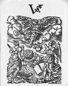 Another more sophisticated emblematic printer's device from 1565. Here it is a woodcut used by Sigmund Feyerabend a printer at Frankfurt. Feyerbend used a number of different printer's marks or devices. This could be easily confused with an actual emblem. |