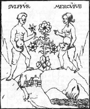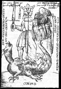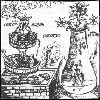 The manuscript 8° Chem 32, entitled Das Kunstbüchlein, in the Murhardsche Bibliotek in Kassel in Germany, is dated 1549, a year before the Rosarium philosophorum book was published. This 'little book of the art' [of alchemy] which was written by Caspar Hartung vom Hoff, contains 25 sketchy line drawings. Twelve of these show imagery which appeared in the woodcuts of the Rosarium. One cannot be entirely sure which came first as the Rosarium could have been written and illustrated a few years before 1550, and