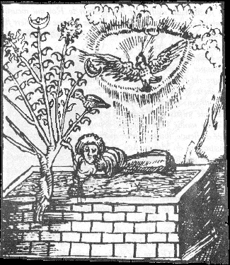 Hartung vom Hoff had access to it then. It could also be that there was some other manuscript with the Rosarium images which predated both of these works. More research needs to be done to clear up this problem. Here below are the twelve images from the manuscript which correspond to the Rosarium images. The particular Rosarium woodcut image is here noted below each of the drawings.