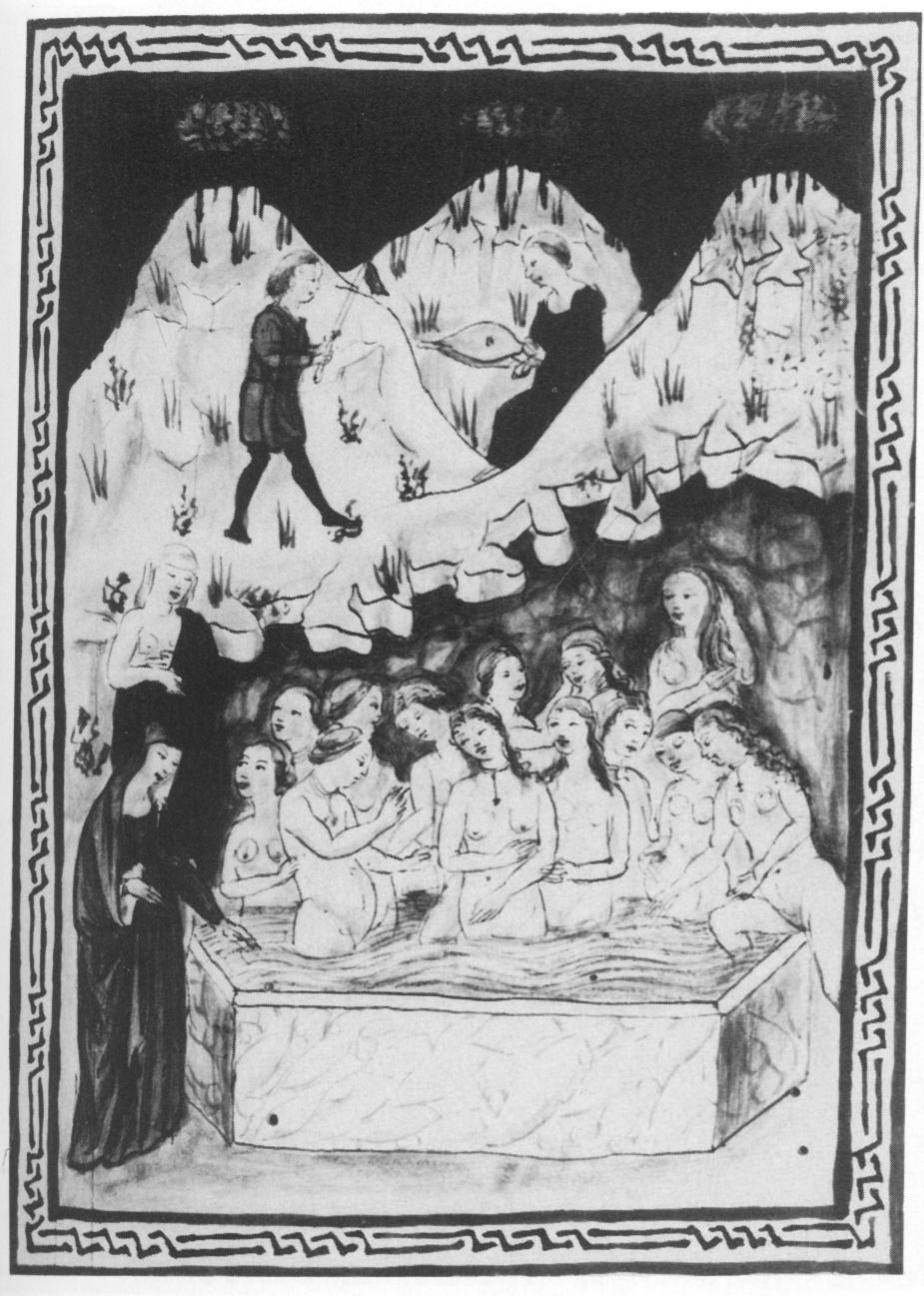 Here is an image from one of the De Balneis manuscripts showing bathers in a communal pool.