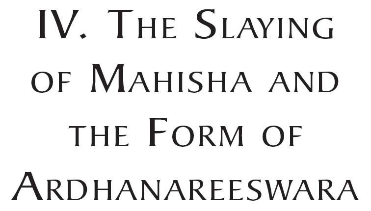 (The events that followed are well known and we shall confine ourselves to certain interesting aspects alone). In the battle that ensued, Mahisha, the buffalo-headed demon, proved redoubtable to Durga, the militant emanation from Parvati. When decapitated, the ‘buffalo’ took the form of a mad elephant. Beheaded, he went on successively taking the forms of a horse, of darkness and even appeared before Her as Brahma and Vishnu. Then Durga prayed to Uma in Her heart. The Supreme directed Her to continue till the Asura assumed his original buffalo form. She was then to cut off his head and hold it under Her foot. Mahisha met his end thus. (Sri Ramana too prays in his Arunachala Padikam, verse 7, “Resident as I am in the non-dual Heart, who is it that comes out? Manifest thyself, O Arunachala; place Thy broad feet on his head, and subdue him!” Again, in Forty Verses, he declares Mahisha’s secret, “It arises dependent and feeding on form; it abandons one form for another; when enquired into its original form, it is no more! Such is the formless ego-demon.”)