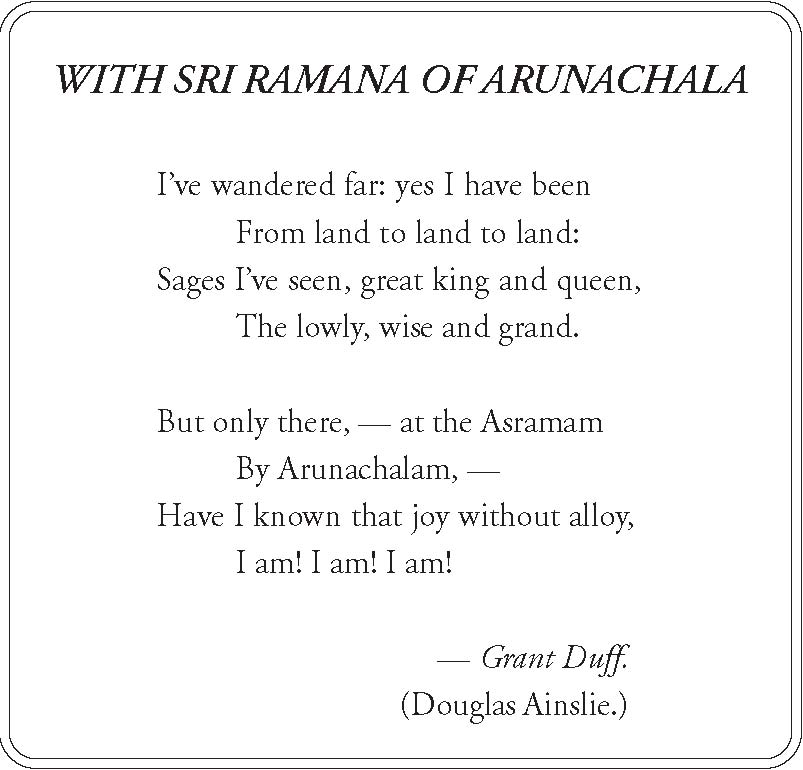 I have tried in my humble way to tell about the wonderful experience I had when I was at Sri Ramanashramam with the Enlightened One, but mere words can never express the peace and joy one feels in His Presence; it must be experienced. There one truly has a glimpse of the Eternal.