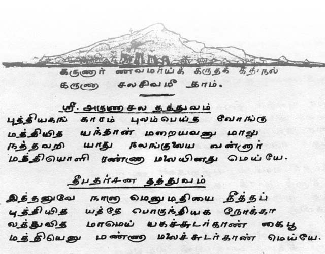 Sri Bhagavan with devotees in front of the Ashram office 181 Ink sketch of Arunachala by Sri Bhagavan and verses to Arunachala in Bhagavan’s own handwriting 193 Sri Bhagavan’s last photograph taken ten days before Mahanirvana in 1950 202 The Samadhi Shrine of Sri Bhagavan today 214
