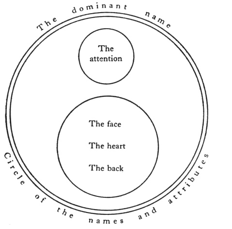 describes it as "the eternal light and the sublime consciousness (sirr) revealed in the quintessence (ayn) of created beings (Mohammed), that God may behold Man thereby 1"; as "the Throne of God (al-Arsh) and His Temple in Man the centre of Divine consciousness and the circumference of the circle of all that exists actually or ideally 2." It reflects all the Divine names and attributes at once, yet quickly changes under the influence of particular names. Like a mirror, it has a face and a back. The face is always turned towards a light called the attention (al-hamm), which is the eye of the heart, so that whenever a name becomes opposite to, or as we should say, strikes the attention, the heart sees it and receives the impression of it; then this name disappears and is succeeded by others. The "back" of the heart is the place from which the attention is absent 3. Jílí illustrates his meaning by the diagram reproduced here: