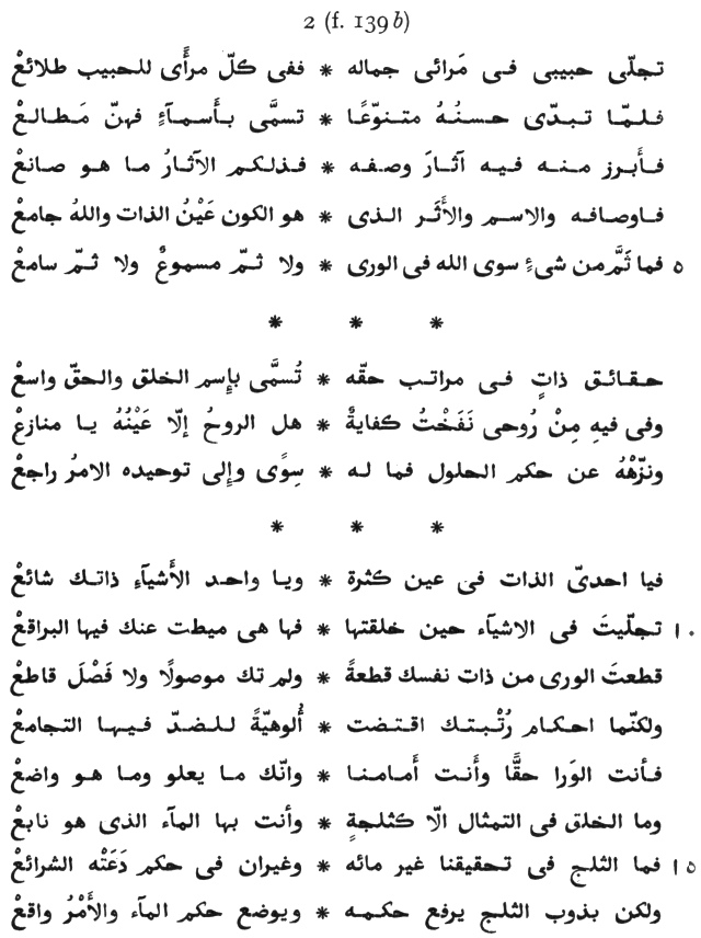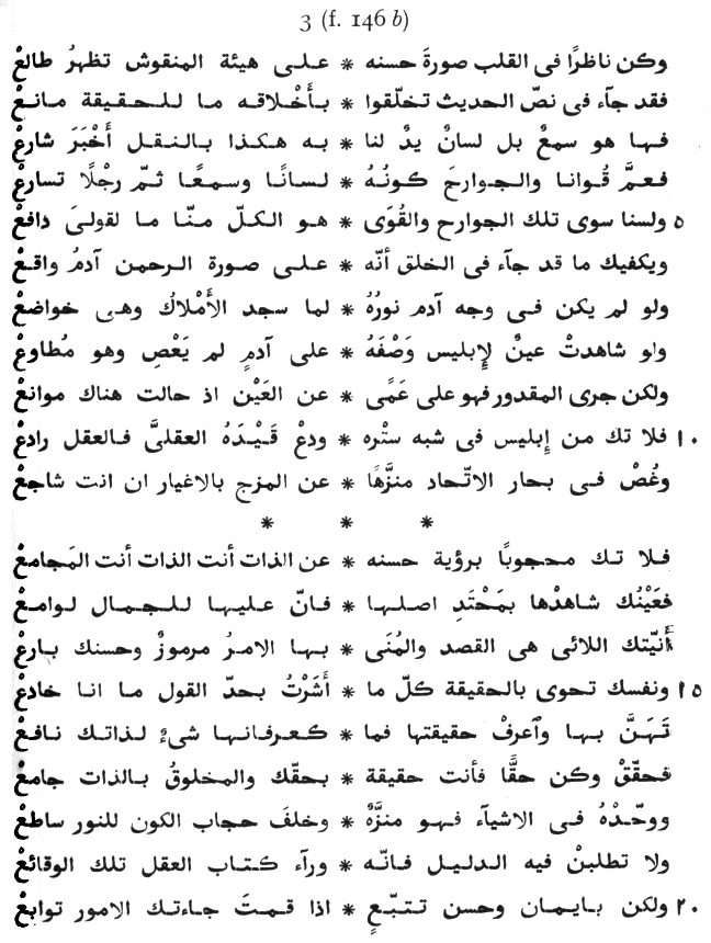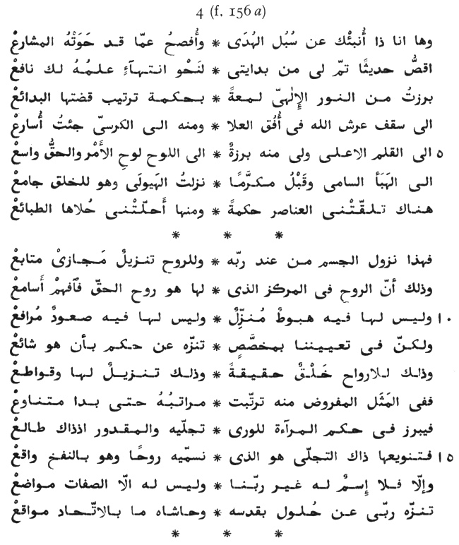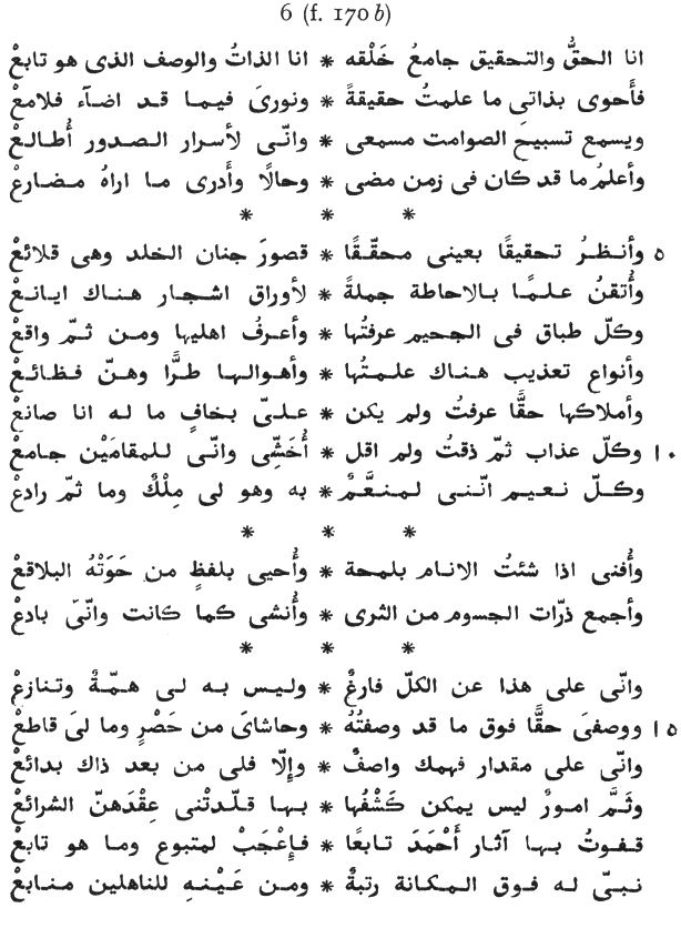 Mention has been made (p. 99, note 2 supra) of Jílí's ode entitled al-Nawádiru ’l-‘ ayniyya fi ’l-bawádiri ’l-ghaybiyya. In the Insánu ’l-Kámil he cites 36 of its 534 verses (I. 30, 3; 39, 6 fr. foot; 52, 17; 66, 19; and 76, 15) and describes it as a magnificent and unique composition, too sublime to be fully understood. It is, however, little more than a versified summary of matter set forth in the Insánu ’l-Kámil, though in some instances the author expresses himself with a freedom and boldness which would hardly be tolerated in a prose treatise. As a poem, apart from its ungraceful style, it suffers from expounding a theory of mystical philosophy and cannot bear comparison with Ibnu ’l-Fáriḍ's Tá’iyya—the poetry of pure mysticism. The extracts given below have been copied from a manuscript in the British Museum (Or. 3684; Rieu's Suppl. to the Catalogue of Arabic MSS. No. 245) containing the text together with a commentary by ‘Abdu ’l-Ghaní al-Nábulusí.