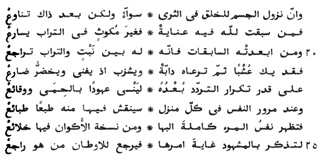 v. ٢٠. The rhyme in this poem is muqayyad. Even Jílí could not have written here, or , (4, v. ٢٢). He neglects the rule that in this form of Ṭawíl the third foot of the second hemistich should be   ̆  ̄  ̆ (not   ̆  ̄  ̄).