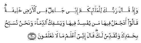 30. Wa-ith qala rabbuka lilmala-ikati innee jaAAilun fee al-ardi khaleefatan qaloo atajAAalu feeha man yufsidu feeha wayasfiku alddimaa wanahnu nusabbihu bihamdika wanuqaddisu laka qala innee aAAlamu ma la taAAlamoona