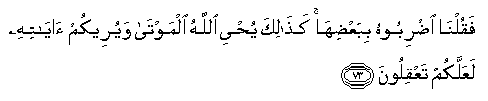 73. So We said: "Strike the (body) with a piece of the (heifer)." Thus Allah bringeth the dead to life and showeth you His Signs: Perchance ye may understand.