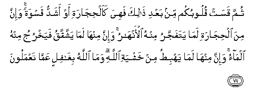 74. Thumma qasat quloobukum min baAAdi thalika fahiya kaalhijarati aw ashaddu qaswatan wa-inna mina alhijarati lama yatafajjaru minhu al-anharu wa-inna minha lama yashshaqqaqu fayakhruju minhu almao wa-inna minha lama yahbitu min khashyati Allahi wama Allahu bighafilin AAamma taAAmaloona