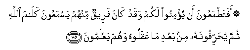 75. AfatatmaAAoona an yu/minoo lakum waqad kana fareequn minhum yasmaAAoona kalama Allahi thumma yuharrifoonahu min baAAdi ma AAaqaloohu wahum yaAAlamoona