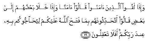 76. Wa-itha laqoo allatheena amanoo qaloo amanna wa-itha khala baAAduhum ila baAAdin qaloo atuhaddithoonahum bima fataha Allahu AAalaykum liyuhajjookum bihi AAinda rabbikum afala taAAqiloona