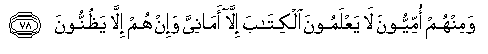 78. Waminhum ommiyyoona la yaAAlamoona alkitaba illa amaniyya wa-in hum illa yathunnoona