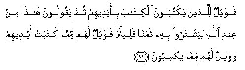 79. Fawaylun lillatheena yaktuboona alkitaba bi-aydeehim thumma yaqooloona hatha min AAindi Allahi liyashtaroo bihi thamanan qaleelan fawaylun lahum mimma katabat aydeehim wawaylun lahum mimma yaksiboona