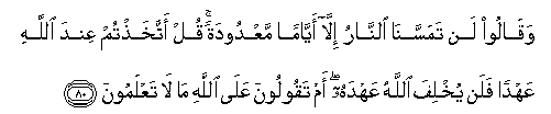 80. Waqaloo lan tamassana alnnaru illa ayyaman maAAdoodatan qul attakhathtum AAinda Allahi AAahdan falan yukhlifa Allahu AAahdahu am taqooloona AAala Allahi ma la taAAlamoona
