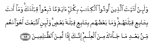 145. Wala-in atayta allatheena ootoo alkitaba bikulli ayatin ma tabiAAoo qiblataka wama anta bitabiAAin qiblatahum wama baAAduhum bitabiAAin qiblata baAAdin wala-ini ittabaAAta ahwaahum min baAAdi ma jaaka mina alAAilmi innaka ithan lamina alththalimeena