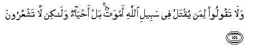154. Wala taqooloo liman yuqtalu fee sabeeli Allahi amwatun bal ahyaon walakin la tashAAuroona
