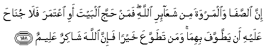158. Inna alssafa waalmarwata min shaAAa-iri Allahi faman hajja albayta awi iAAtamara fala junaha AAalayhi an yattawwafa bihima waman tatawwaAAa khayran fa-inna Allaha shakirun AAaleemun