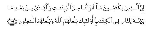 159. Inna allatheena yaktumoona ma anzalna mina albayyinati waalhuda min baAAdi ma bayyannahu lilnnasi fee alkitabi ola-ika yalAAanuhumu Allahu wayalAAanuhumu allaAAinoona