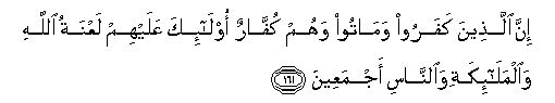 161. Inna allatheena kafaroo wamatoo wahum kuffarun ola-ika AAalayhim laAAnatu Allahi waalmala-ikati waalnnasi ajmaAAeena