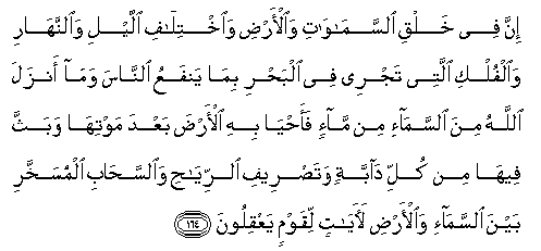164. Inna fee khalqi alssamawati waal-ardi waikhtilafi allayli waalnnahari waalfulki allatee tajree fee albahri bima yanfaAAu alnnasa wama anzala Allahu mina alssama-i min ma-in faahya bihi al-arda baAAda mawtiha wabaththa feeha min kulli dabbatin watasreefi alrriyahi waalssahabi almusakhkhari bayna alssama-i waal-ardi laayatin liqawmin yaAAqiloona
