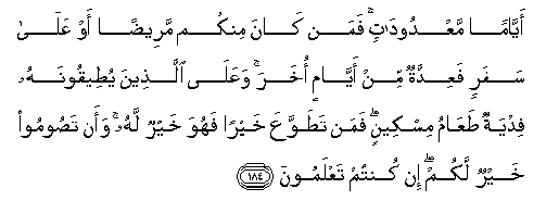 184. Ayyaman maAAdoodatin faman kana minkum mareedan aw AAala safarin faAAiddatun min ayyamin okhara waAAala allatheena yuteeqoonahu fidyatun taAAamu miskeenin faman tatawwaAAa khayran fahuwa khayrun lahu waan tasoomoo khayrun lakum in kuntum taAAlamoona